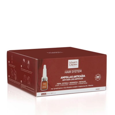 These Hair System Anti Hair-Loss Ampoules contain high concentrations of the three MartiDerm® growth factors (HGFx3®), which stimulate growth and cell renewal, revitalising and nourishing the scalp. They are effective in androgenic alopecia and telogen effluvium, two of the most common types of hair loss. Using biotechnological innovation, the hair growth phase (anagen) is lengthened and the hair fall phase (telogenic) is reduced. With a light texture, it contains no allergens or parabens, and has low alcohol content.